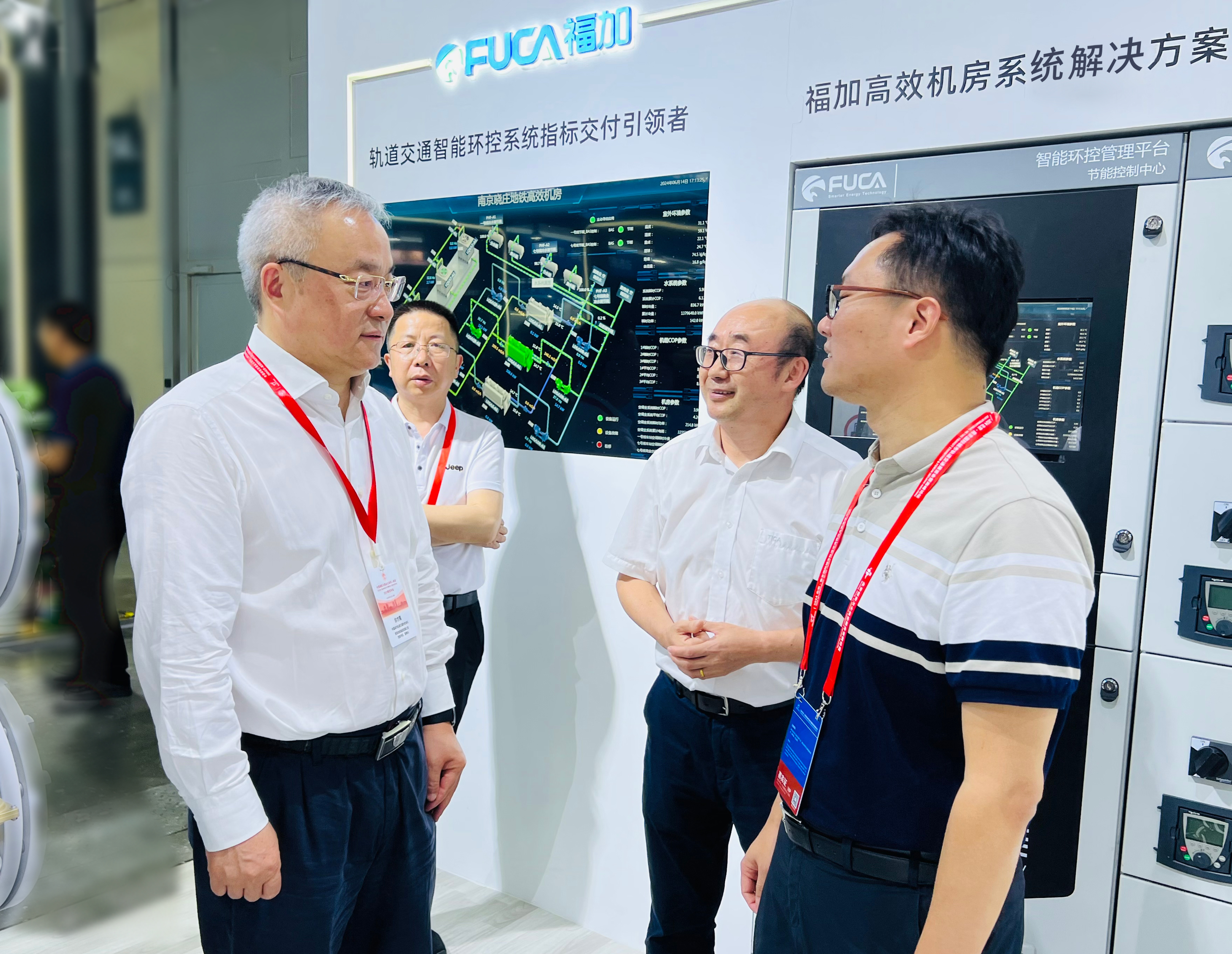 南京地鐵集團(tuán)佘董事長(zhǎng)蒞臨天加展臺(tái),佘董對(duì)南京地鐵高效機(jī)房試點(diǎn)站-曉莊站項(xiàng)目予以了關(guān)注和認(rèn)可,該項(xiàng)目是由天加和福加聯(lián)合實(shí)施,于2023年交付,其制冷機(jī)房系統(tǒng)年均運(yùn)行能效比達(dá)6.0以上,空調(diào)全系統(tǒng)年均運(yùn)行能效比達(dá)4.2以上,是南京首個(gè)基于高效制冷機(jī)房能效指標(biāo)交付的軌道交通地下站點(diǎn)。