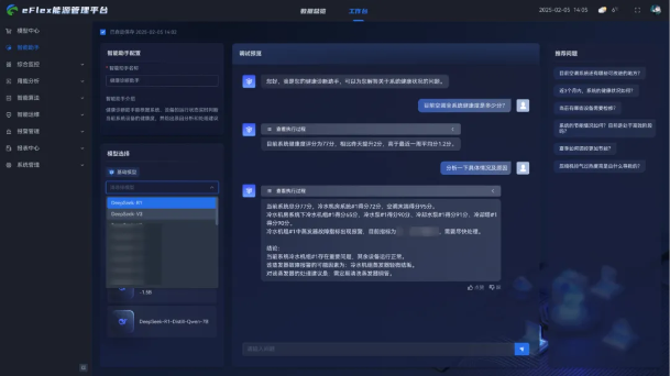 接入DeepSeek后,提供豐富的預訓練模型選擇,涵蓋通用與暖通行業(yè)專用的大規(guī)模及輕量級模型,用戶可根據(jù)具體業(yè)務場景靈活選用,并支持模型性能評估、快速部署及實時測試,滿足多樣化應用需求。
