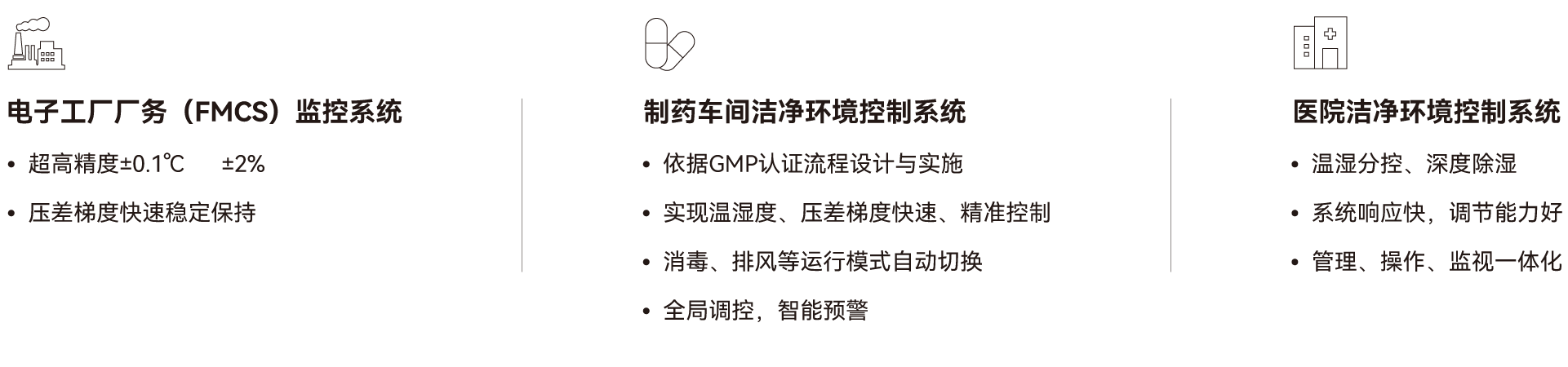 廣泛應用于電子潔凈廠房、醫(yī)院潔凈手術(shù)室、ICU、NICU等凈化病房、食品加工廠房、GMP制藥企業(yè)與精密儀器制造工業(yè)廠房、化工潔凈廠房、精密實驗室等行業(yè)凈化空調(diào)系統(tǒng),可實現(xiàn)系統(tǒng)溫濕度、風量、潔凈度及壓差梯度的自動調(diào)節(jié)及各種安全保護、聯(lián)鎖、節(jié)能運行等控制功能,以最大限度地保證潔凈場所溫濕度、壓差的控制及精度要求。