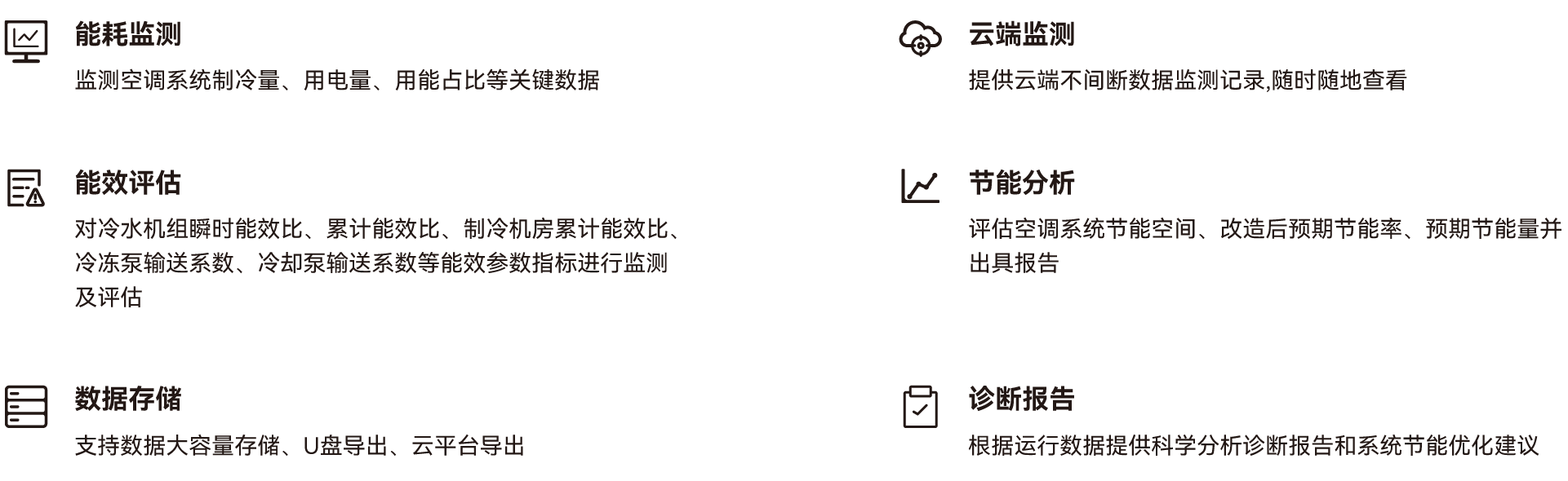 診斷平臺(tái)通過(guò)數(shù)據(jù)采集、能耗監(jiān)測(cè)、能效評(píng)估、節(jié)能分析等功能,全方位為客戶提供制冷機(jī)房能效診斷及技術(shù)咨詢與節(jié)能改造服務(wù)。
